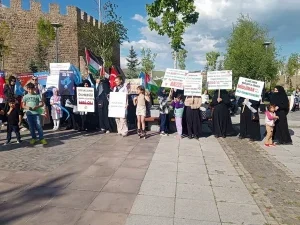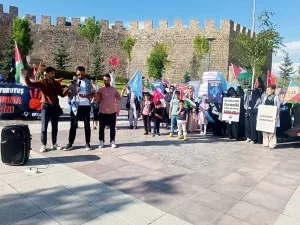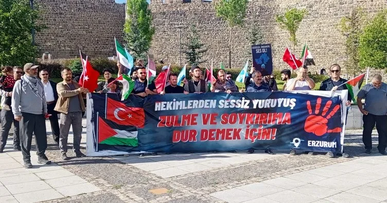 Erzurum Kalesi önünde bir araya gelen grup, Türk, Filistin ve Doğu Türkistan bayrakları ile dövizler taşıyarak kalenin içinde sessiz yürüyüş gerçekleştirdi. Sağlıkçılar, saldırılara dikkat çekmek ve mazlumların sesi olmak amacıyla yürüyüşlerine aralıksız devam ettiklerini vurguladı.