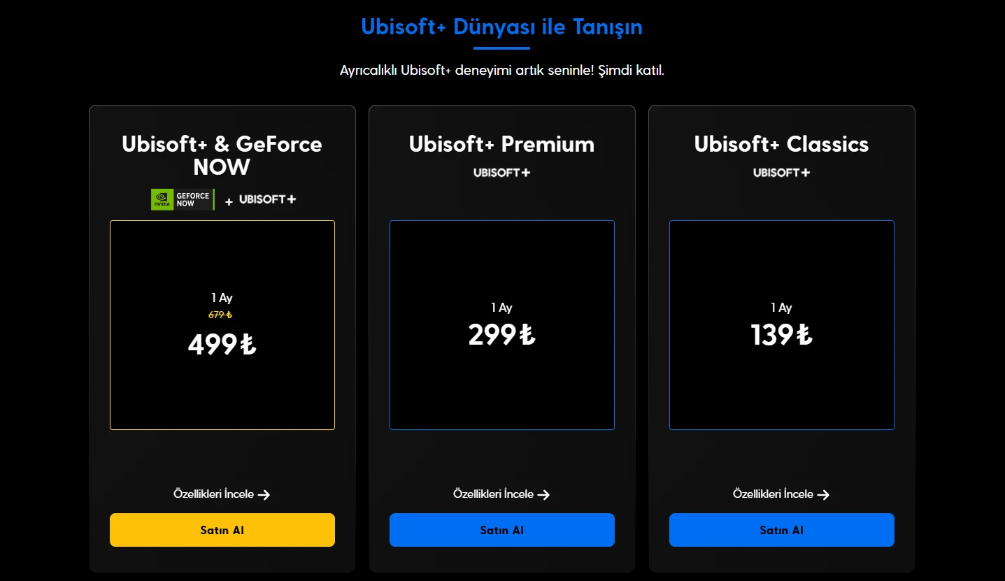 Ubisoft+, Fransız oyun devi Ubisoft’un geliştirdiği ve kullanıcıların aylık ücret karşılığında onlarca oyuna erişmesini sağlayan bir servis. Game+ üzerinden sunulan hizmette üç farklı abonelik seçeneği bulunuyor. Ubisoft+ Classics paketi 139 TL, Ubisoft+ Premium 299 TL ve Ubisoft+ ile GeForce NOW’un birleştiği ortak paket ise 499 TL fiyat etiketiyle satışa çıktı.