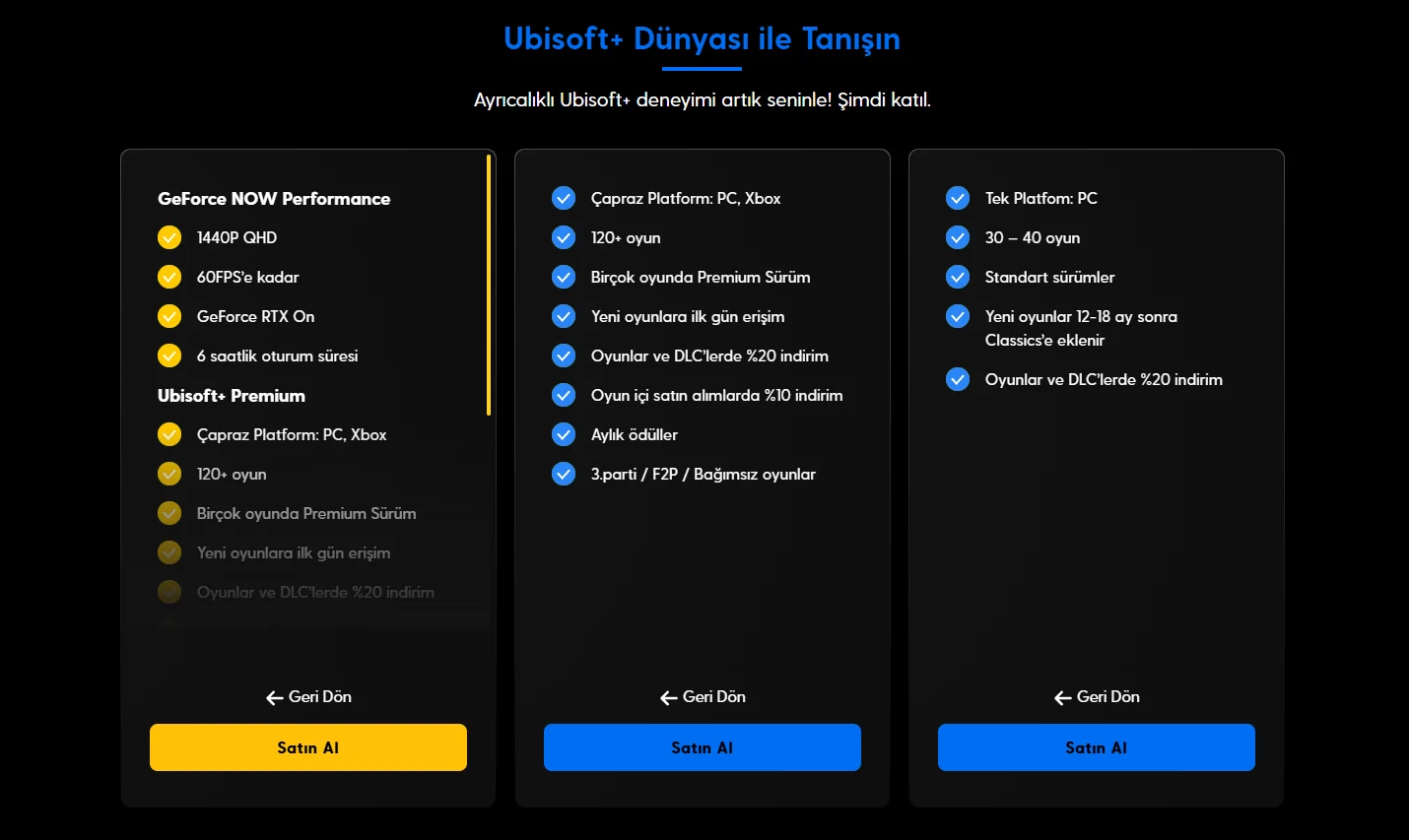GeForce NOW ile Ubisoft+ Premium’un birleştirildiği paket ise hem Ubisoft kütüphanesine erişim hem de GeForce NOW üzerinden oyunları yüksek performansla bulutta oynama imkanı sunuyor. 1440p çözünürlük, RTX açık mod, 60 FPS desteği ve 6 saatlik oturum süresi bu paketin teknik avantajları arasında yer alıyor.